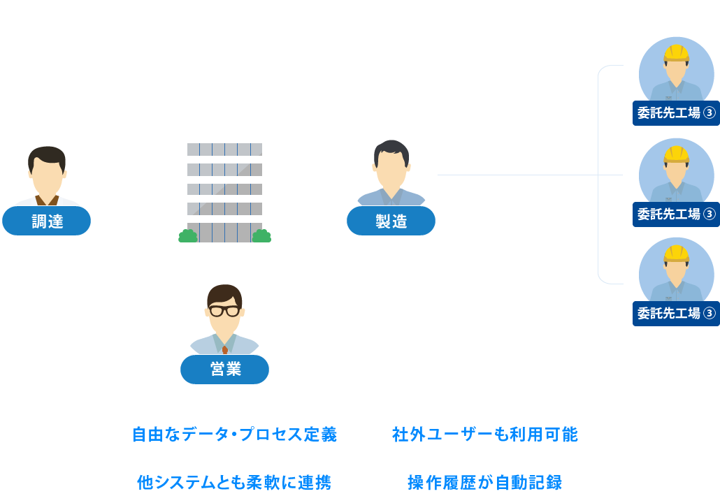 Business b-ridgeは、ERPや専用業務ソフトウェア等ではカバーされにくい、社外関係者を含む連携業務をスピーディにシステム化できる、アプリケーション構築・運用基盤クラウドサービスです。多くの場合紙・Excelとメールで行われているこれら業務を、現場のノウハウを活かしてジャストサイズでシステム化 でき、関係者間での迅速・確実なデータ授受、進捗状況の共有、ムダ作業の削減などを実現できます。